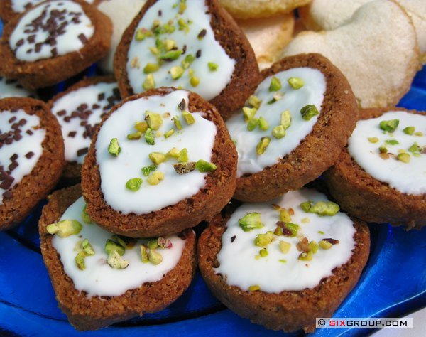 Eigelbe und übrigen Zucker im heißen Wasserbad aufschlagen, dann im kalten Wasserbad kalt schlagen. Auf die Unterseite der Plätzchen geben und mit Pistazien bestreuen.