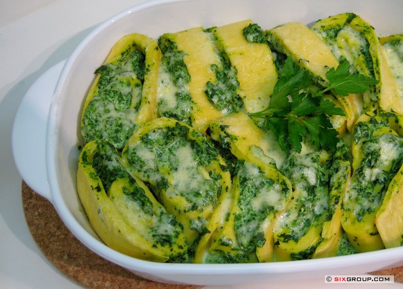 Spinat- Ricotta- Masse auf die Pfannkuchen verteilen, aufrollen und in Scheiben schneiden. In eine feuerfeste gefettete Form legen. Mit Parmesan bestreuen und ca. 15-20 Min. backen.