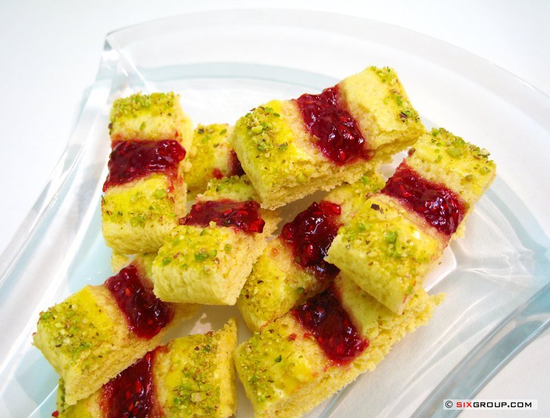 Teig auf bemehlter Arbeitsfläche 1/2cm dünn ausrollen. In Streifen (20x4 cm) teilen, in die Mitte eine Vertiefung drücken. Konfitüre hineinstreichen. Eigelb verquirlen, Ränder damit bepinseln, mit Pistazien bestreuen. Auf einem mit Backpapier ausgelegten Blech ca. 10Min. backen. Streifen in 2cm große Stücke teilen und auskühlen lassen.
