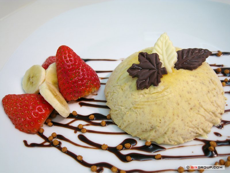 Das Parfait mit der Frischhaltefolie aus der Form heben. In Scheiben schneiden und mit frischen Früchten oder Schokoladesauce anrichten.