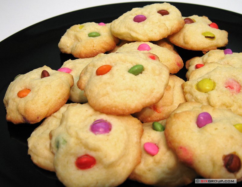 In einer Schüssel Butter, Zucker, Salz und den Vanillezucker mit den Schneebesen des Handrührgerätes schaumig rühren, bis sich der Zucker gelöst hat. Ei unterrühren. Mehl mit Backpulver mischen und unterrühren. Zum Schluß die Smarties unterheben.